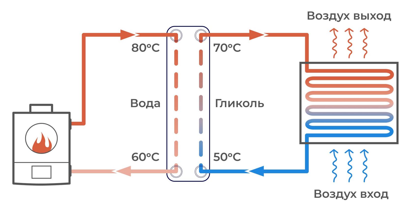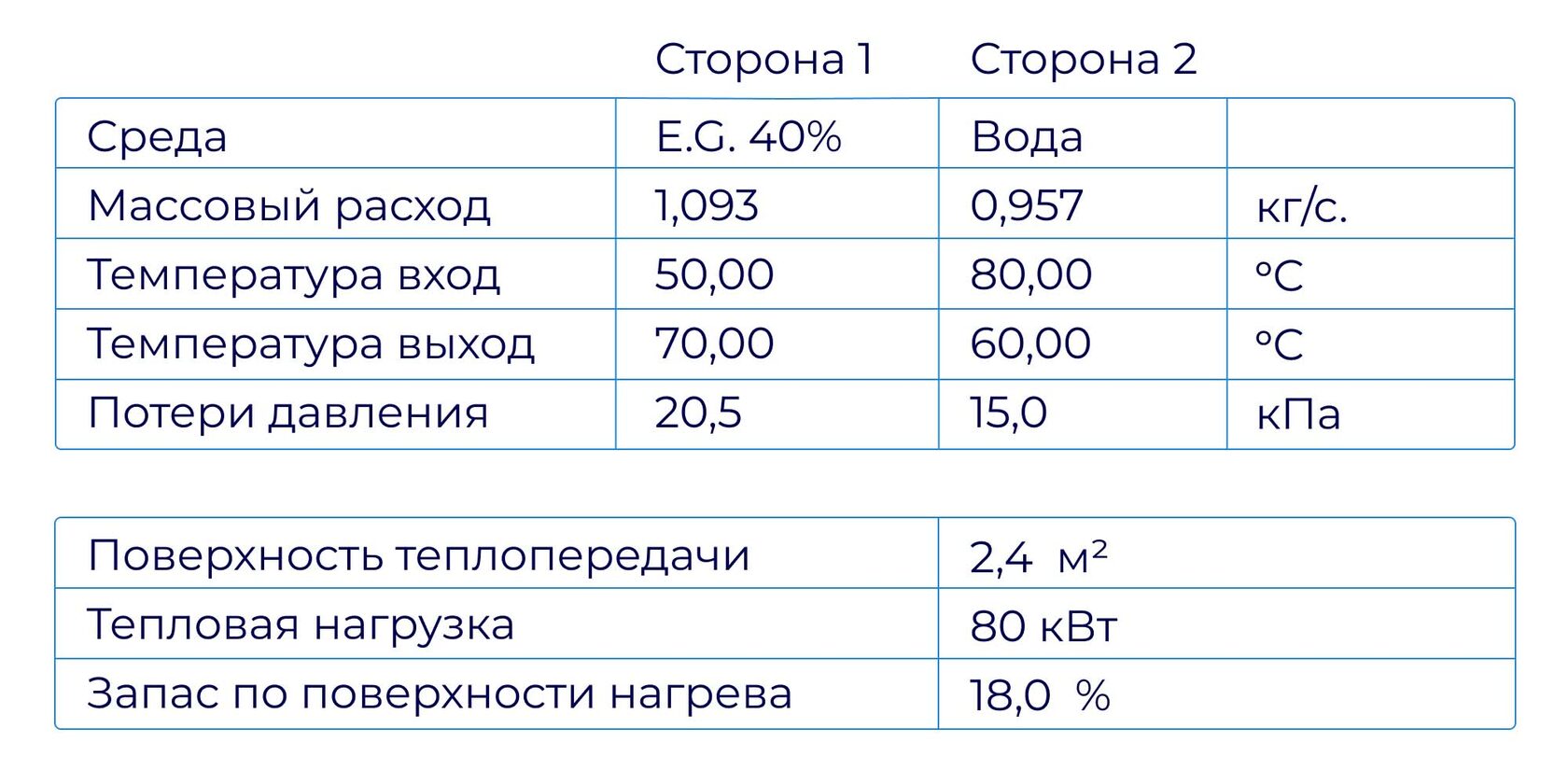 Паяный пластинчатый теплообменник для вентиляции. Мощность 80кВт. Греющий теплоноситель — вода. Вход: 80 °C, выход:60°C. Нагреваемый теплоноситель — этиленгликоль 40%. Вход: 50 °C, выход: 70 °C.