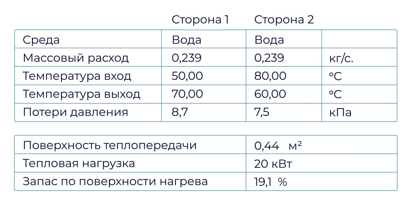 Паяный пластинчатый теплообменник для отопления площади до 130м². Мощность 20кВт. В расчёте учитываем, что на 1м² площади требуется 150Вт нагрузки. Греющий теплоноситель – вода. Вход: 80°C, выход:60°C. Нагреваемый теплоноситель - вода. Вход: 50°C, выход: 70°C.